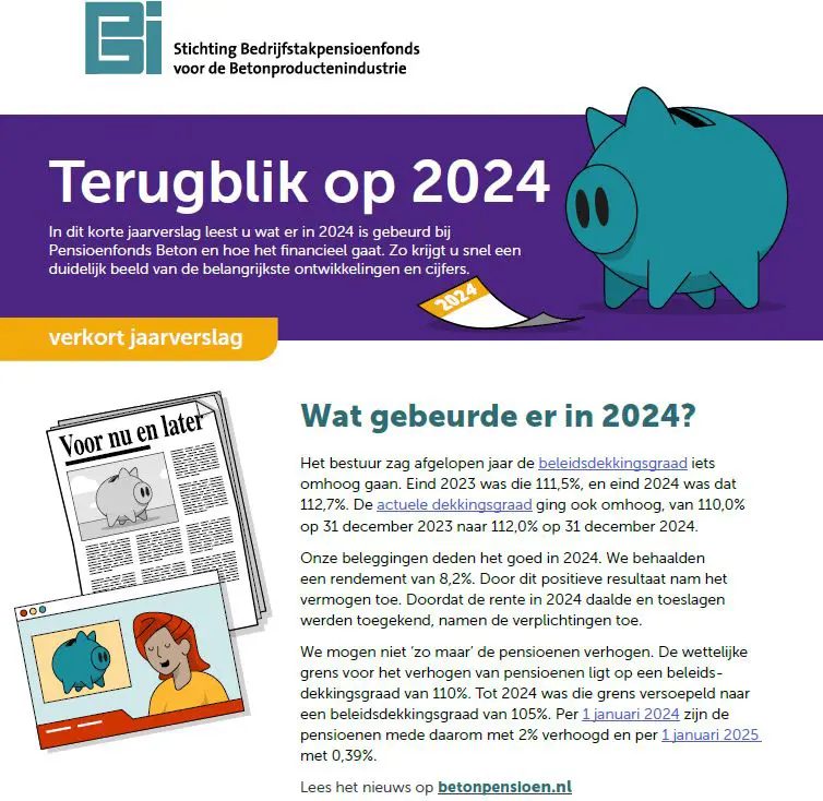 Wij maakten een jaarverslag over 2024. Hierin kunt u uitgebreid lezen hoe het jaar 2024 is verlopen voor ons pensioenfonds.